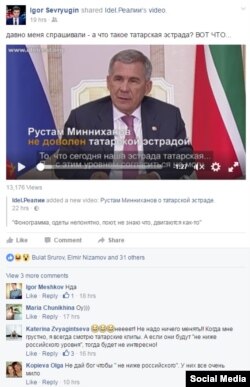 Видеоролик, в котором президент Татарстана комментирует качество современной татарской эстрады (создан порталом "Idel.Реалии"), не на шутку всполошил пользователей социальной сети Facebook. Менее чем за сутки ролик набрал более 13 тысяч просмотров - и это только в Facebook.