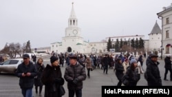 В полдень накануне у входа в Кремль стали собираться люди. О походе к госсоветнику Татарстана Минтимеру Шаймиеву заявили накануне днем, но уже на следующий день на площади 1 мая собрались несколько десятков человек. Через несколько минут их количество перевалит за сотню.