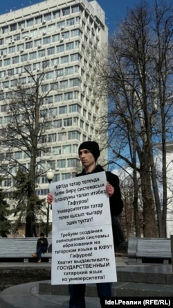 Сегодня в Казани, напротив главного здания Казанского федерального университета, прошел одиночный пикет, на котором заместитель председателя союза татарской молодежи "Азатлык" Рафик Каримуллин потребовал создать полноценную систему образования на татарском языке в КФУ". "Гафуров! (Ильшат Гафуров — ректор КФУ — ред.) Хватит выдавливать государственный татарский язык из университета!", — значилось на плакате на двух языках — татарском и русском.