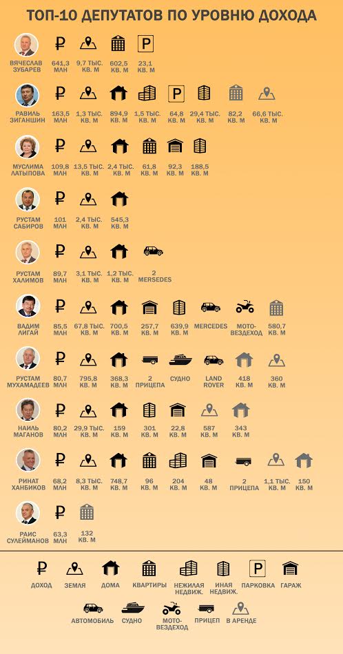 Самый богатый депутат Госсовета в 2016 году заработал 641,3 млн рублей. Им стал Вячеслав Зубарев, председатель совета директоров "ТрансТехСервиса". За ним расположился "главный строитель Татарстана" глава ПСО "Казань" Равиль Зиганшин с 163,5 млн рублей дохода и владелица сети супермаркетов "Бәхетле" Муслима Латыпова с 109,8 млн рублей. Сколько заработал топ-10 депутатов Госсовета в прошлом году и чем они владеют — в инфографике "Idel.Реалии".