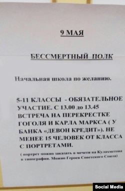 В чате родителей казанской гимназии №102 распространяется фото объявления, в котором учеников 5-11 классов обязывают участвовать в акции "Бессмертный полк". В объявлении отмечается, что явка учеников начальной школы добровольная, а ученики средних и старших классов должны явиться на шествие в обязательном порядке в количестве не менее 15 человек от класса.