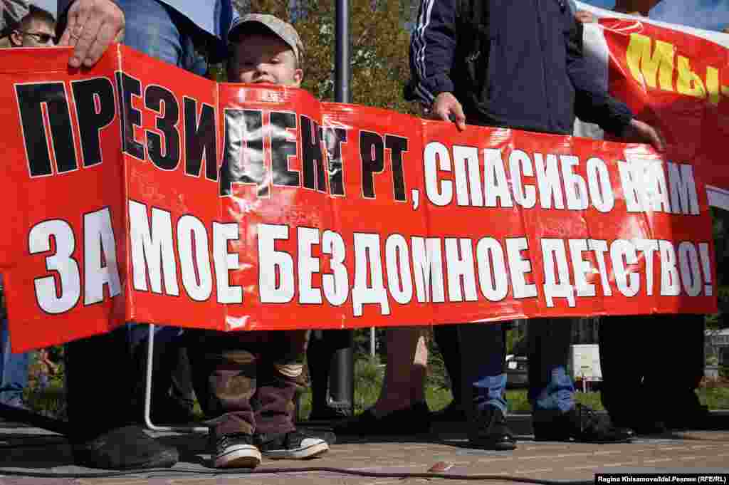 "Казань — столица обманутых дольщиков!", "Мы хотим в свой дом!", "Президент РТ, спасибо вам за мое бездомное детство", "Ждем возобновления строительства", "Наши дети тоже хотят жить в своих квартирах" — с такими плакатами вышли митингующие. Смотрите другие наши фотогалереи здесь.