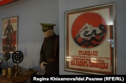 — Завершает гражданскую войну вполне себе "живой" персонаж. Эта шинель принадлежала известному красному командиру Борису Исаевичу Гольдбергу, который в 1919 году являлся командующим Запасной Армией Республики, а с июля по сентябрь 1920 года был членом Временного революционного комитета, готовившего Учредительный Съезд Советов Татреспублики. На голове у него новодельная буденовка: пришлось сделать копию по образцу 1918 года, еще с молотом и плугом, а не с серпом. В этой же витрине, посвященной рождению Красной Армии, помещена наградная серебряная шашка, карабин, наган.