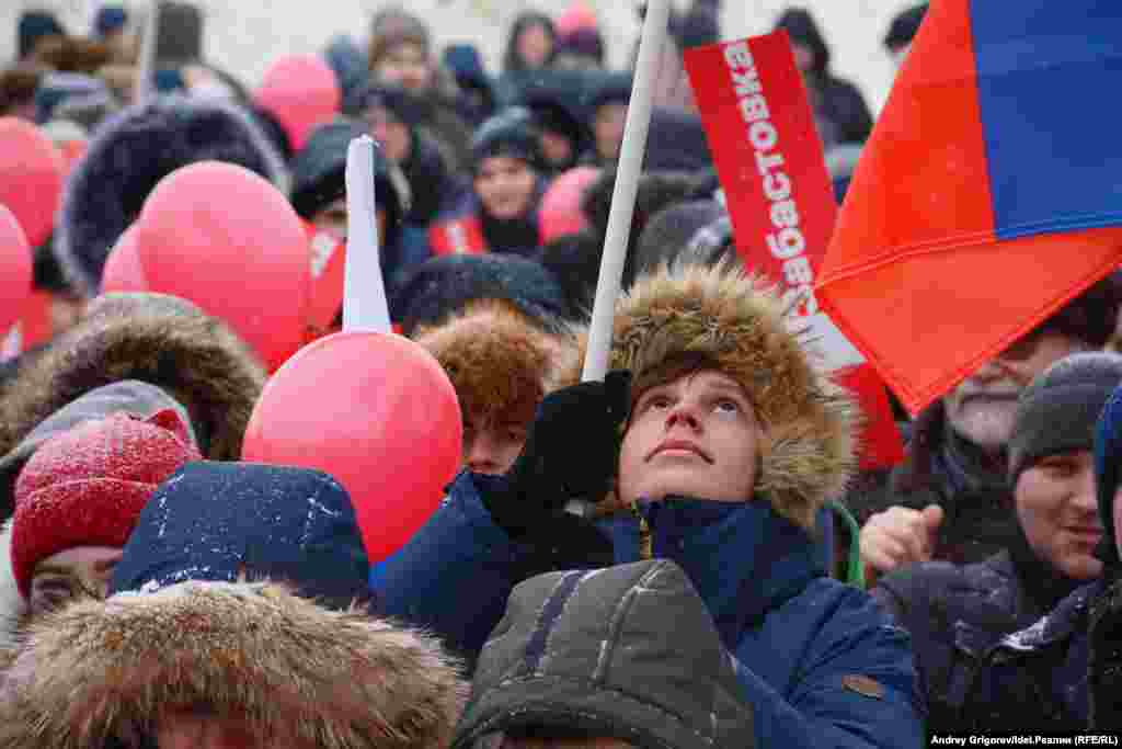 Протестующие держали в руках флаги России, красные воздушные шары, таблички со словом "забастовка", плакаты "18 марта выбираю забастовку", "Мне стыдно голосовать", "Сам не иду и вам не советую!", "Мне некого выбирать!"