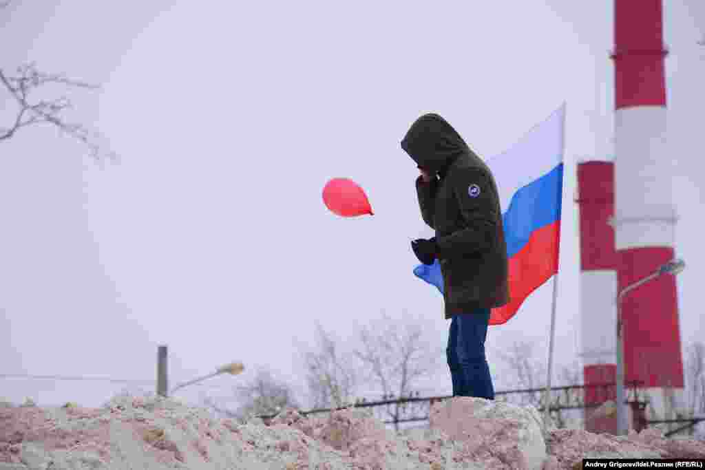 Протестующие держали в руках флаги России, красные воздушные шары, таблички со словом "забастовка", плакаты "18 марта выбираю забастовку", "Мне стыдно голосовать", "Сам не иду и вам не советую!", "Мне некого выбирать!"