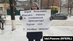 Среди пикетчиков — жительница Ульяновска Людмила Макарова уже не в первый раз выходит на одиночные пикеты и добивается встречи с губернатором области Сергеем Морозовым. Она обвиняет городских чиновников в том, что они незаконно лишили ее социального жилья, по сути оставив без крышей над головой. Власти и прокуратура ситуацию не комментируют.