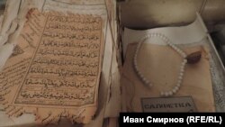 Сотрудник единственного в России музея калмацкой культуры Джамиля Тартыкова показывает национальные костюмы. Здесь же – деревянная кровать, сделанная без единого гвоздя, калмацкая маслобойка, выточенная из цельного куска лиственницы, и пожелтевшие листы Корана, на которых за 200 с лишним лет не стёрлось ни одной буквы.