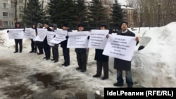 Участники пикета стояли с плакатами "Закрытие НКЦ — преступление против татарского народа", "Президент Минниханов! Убивают культуру, историю татарского народа! Прекратите это преступление! Разрушают музей национальной культуры на Пушкина, 86", "Изгнание собраний музея из здания — всё равно что разрушить музей!".