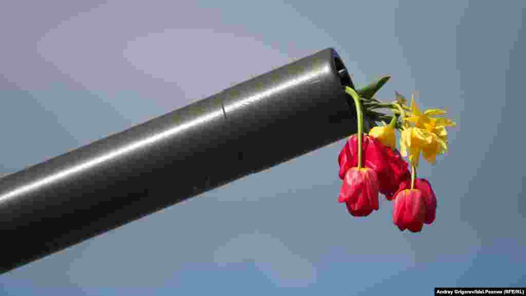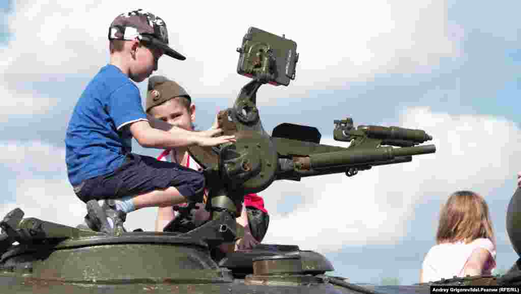Есть в парке Победы, правда, давно опробованные магниты, которые и в этот раз перетянули на себя большинство посетителей: многочисленная военная техника. Дети — в пилотках и без — оседлали танки, пушки, самолеты. Родители снимают их на смартфоны или, напротив, с негодованием требуют, чтобы не забирались слишком высоко. Из дула ближайшего к выходу парка торчит букетик увядших тюльпанов. Праздник удался.