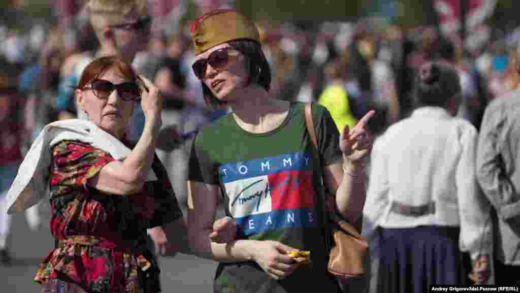 Георгиевские ленты и автомобильные наклейки, которыми уже давно никого не удивишь, оказались потеснены зёлеными пилотками с красными звёздами. Так что теперь георгиевские ленты, вокруг которых поломали столько копий, практически незаметны в пестрой толпе (возможно, потому, что они уже на каждом втором встречном). Тут, правда, тоже заметна некоторая эволюция — некоторые ленты украшены значками и цветочными бутонами — но куда больше бросаются в глаза именно красноармейские пилотки. Торговцы ими расположились у входа в казанский парк Победы. Недорого, 200 рублей — штука. Правда, на взрослые головы головных уборов у продавцов немного. Не то большие размеры уже расхватали, не то основная целевая аудитория — дети.