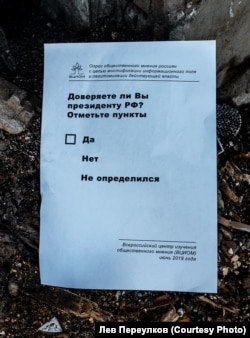 "Доверяете ли вы Путину?" — гласит вопрос на одном из них. Внизу — три варианта ответа, "да", "нет", "не определился", но квадратик для галочки напечатан только напротив первого. "Готовы ли вы выйти на протестную акцию в своем городе?" – гласит вопрос на другом листе. Варианты ответов такие: "Нет, не готов" и "Да, я поддерживаю идеи насилия и хочу дестабилизировать ситуацию в регионе через поддержку опасной оппозиции". Еще один опросный лист: "Есть ли у вас претензии к действующей власти? Опишите их ниже в специальном поле". Специальное поле, однако, оказывается полностью черным, написать на нем что-то попросту невозможно.