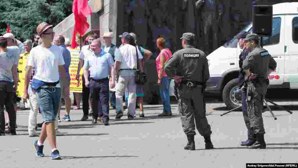 Неожиданностью для участников митинга, состоявшегося в Кировском районе у Красных ворот, стало отсутствие ставших уже привычными для казанских митингов ограждений с досмотром каждого входящего на территорию, отведенную под митинг, сотрудниками полиции. Да и самих полицейских были непривычно мало. Фотокор "Idel.Реалии" насчитал всего пятерых блюстителей закона в форме и, кроме того, не заметил примелькавшихся уже лиц сотрудников центра "Э".