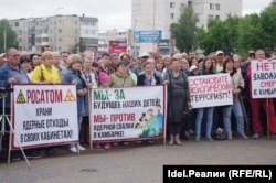 Небольшую площадку с выступающими с трех сторон обступила толпа — приблизительно 500-600 человек. В ней — люди самых разных возрастов. В руках у людей плакаты с надписями: "Мы говорим "нет" переработке опасных отходов в Камбарке!", "Остановите экологический терроризм!", "Нет заводу смерти в Камбарке!", "Мы — за будущее наших детей! Мы — против ядерной свалки в Камбарке!", "Родниковый край не для ядовитой помойки!"