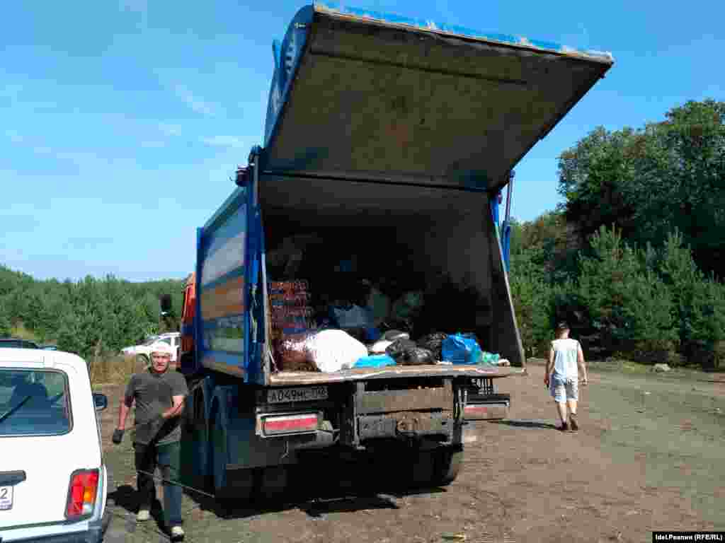 Часть активистов устроила, наконец, экологический субботник — от БСК на горе осталось много мусора. После уборки люди поднимаются на вершину Куштау, откуда видны огромные "белые моря" — шламохранилища БСК, до краев заполненные отходами содового производства. Чуть дальше, в дымке промышленных выбросов едва виднеется Стерлитамак. А под горой — красивейшая долина реки Белой — Ак-Идели.