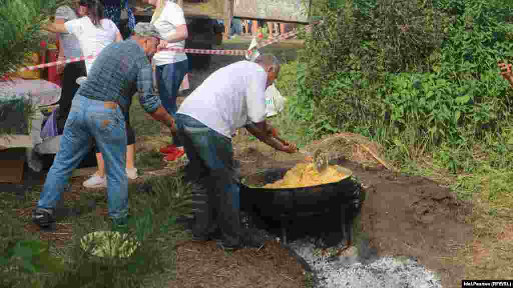 В лагере тем временем готовятся к концерту и праздничному обеду. Артисты повторяют свои номера. Группа активистов разливает чай и помогает двум поварам варить в огромных казанах плов на несколько сот человек.