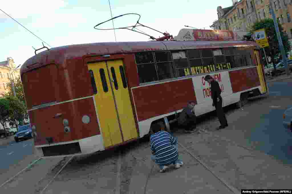 Трамвай-трактир "Пятёрочка" сошёл с рельс и перекрыл проезжую часть на улице Декабристов у остановки Гагарина. Июнь 2007 года.