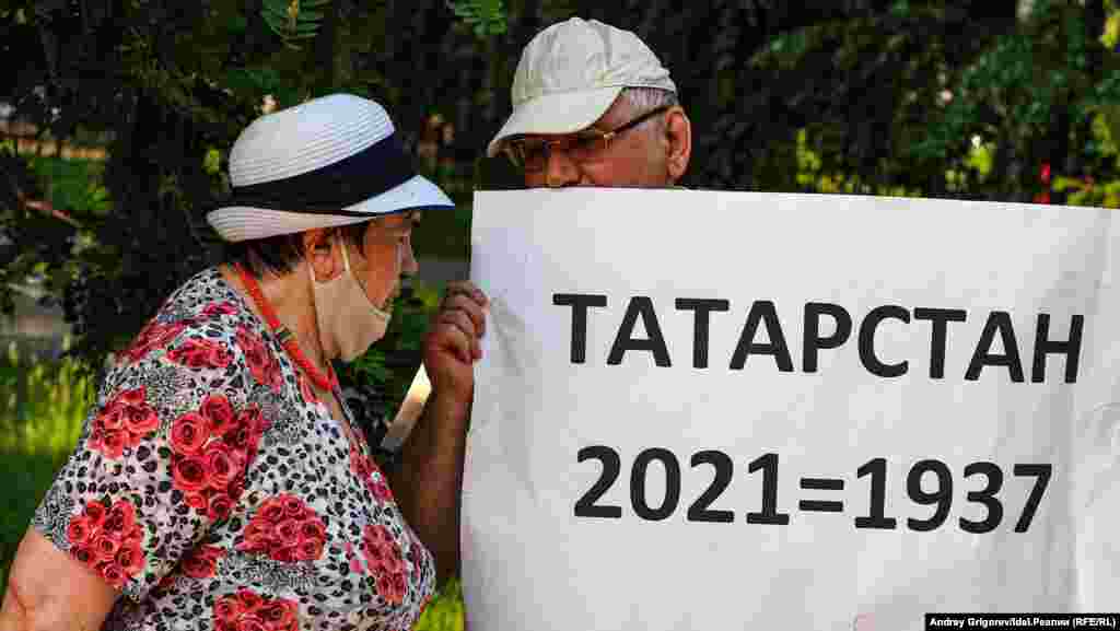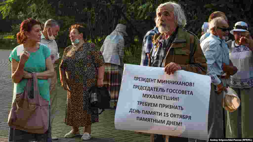 "Прокурор Нафиков! Требуем отказаться от позорного иска против ВТОЦ", гласила надпись на одном из плакатов. Еще на одном плакате была надпись "Татарстан: 2021 = 1937". Кроме того, активисты требовали от президента РТ Рустама Минниханова и председателя Госсовета Татарстана Фарида Мухаметшина признать 15 октября памятным днём (последние несколько лет власти в Татарстане под разными предлогами препятствуют проведению акций, посвященных этой дате).