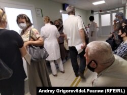 Перед несколькими кабинетами на четвёртом этаже скапливается очередь — полтора десятка пациентов, не меньше. Преобладают пожилые люди. Социальную дистанцию почти никто не соблюдает. Маски у многих под носом или на подбородке.