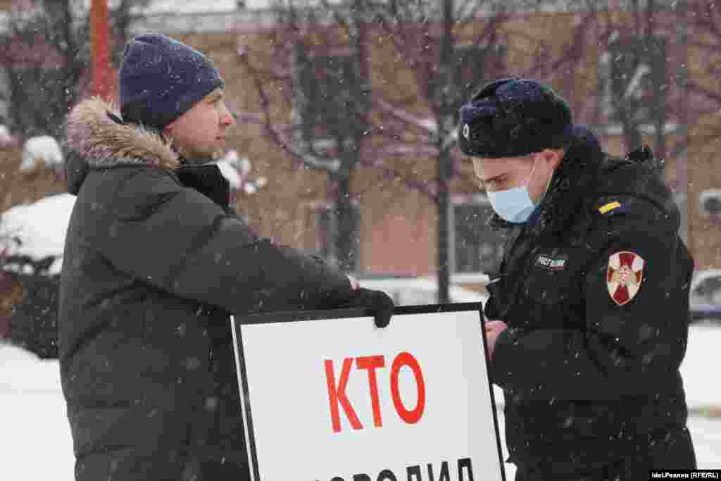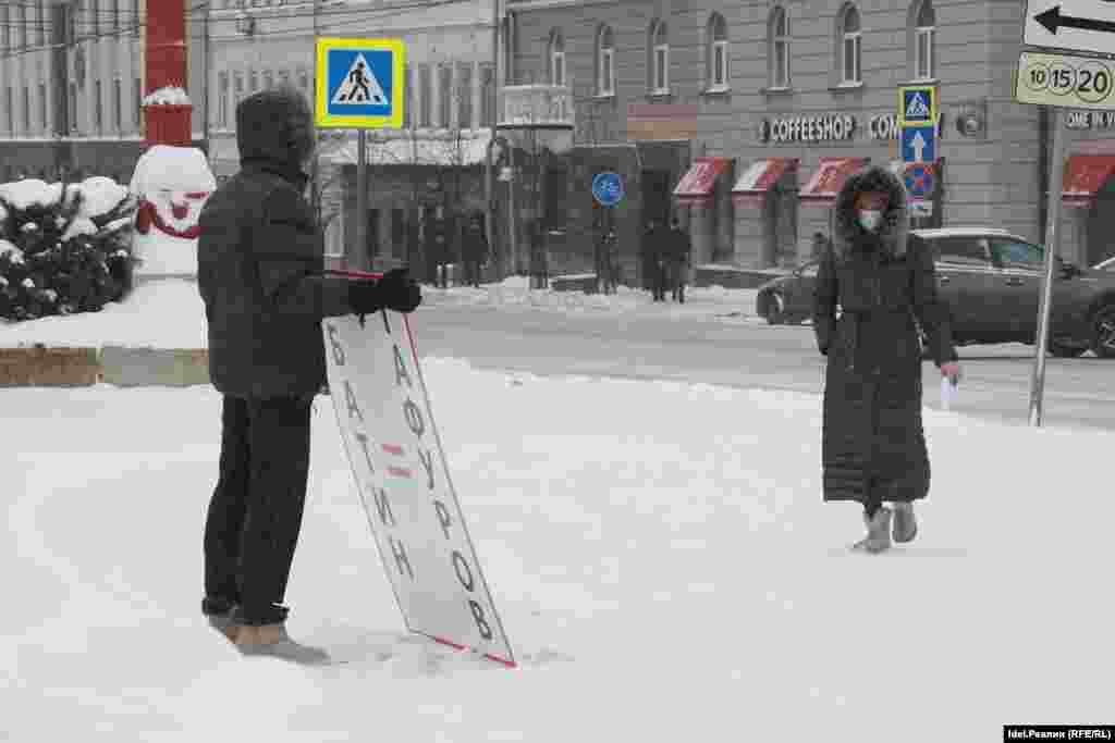 Соловьёв простоял на площади Свободы около часа. За это время к нему подошли четверо человек. Первым оказался мужчина с рацией, представившийся "стажёром" — вместо удостоверения полицейского он показал какую-то справку, следующим был росгвардеец, переписавший паспортные данные пикетчика, третьей оказалась сотрудница канцелярии Кабмина РТ, предложившая Алексею оставить заявление. Наконец, четвёртым был пожилой мужчина, спросивший, кто, по мнению Соловьёва, стоит за убийствами Бориса Немцова и Анны Политковской. Официального ответа на эти вопросы, как и на вопросы Соловьёва, не получено до сих пор.