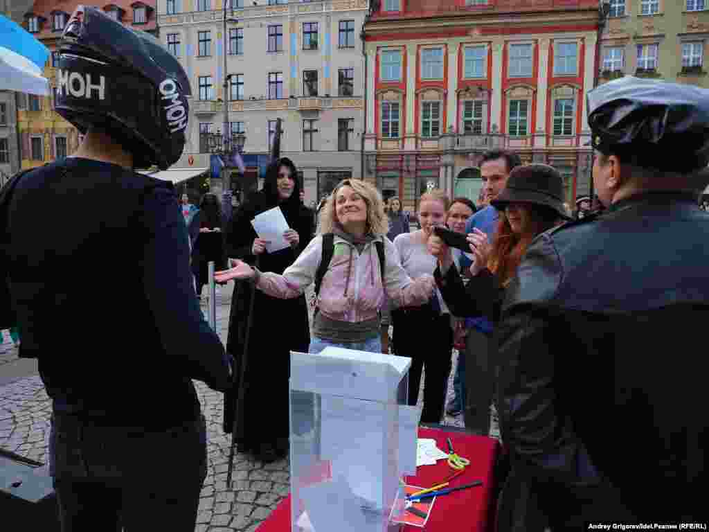 С начала нападения РФ на Украину россияне, живущие во Вроцлаве, проводят у городской ратуши театрализованные акции протеста. Очередная, в сентябре, была посвящена минувшим российским выборам. Участники постановки предлагали прохожим проголосовать.