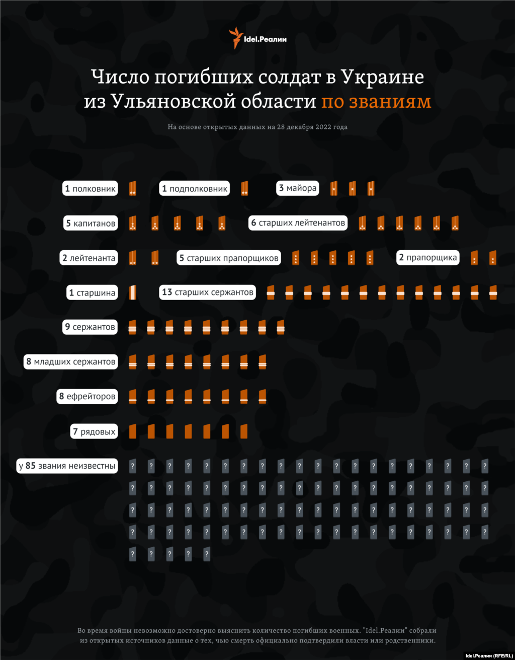 По официальным сведениям и источникам среди родственников погибших, в первые 10 месяцев войны в Украине погибли 156 человек из Ульяновской области. "Idel.Реалии" обнаружили десятки могил военных, о смерти которых не сообщалось до сих пор. Подробности читайте здесь.