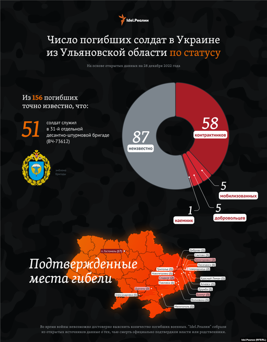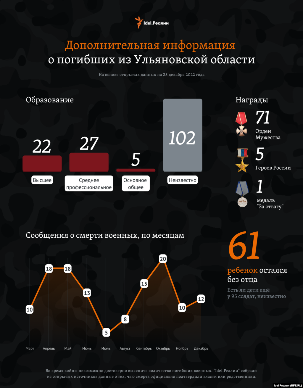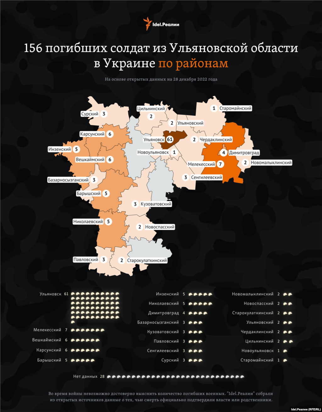 По официальным сведениям и источникам среди родственников погибших, в первые 10 месяцев войны в Украине погибли 156 человек из Ульяновской области. "Idel.Реалии" обнаружили десятки могил военных, о смерти которых не сообщалось до сих пор. Подробности читайте здесь.