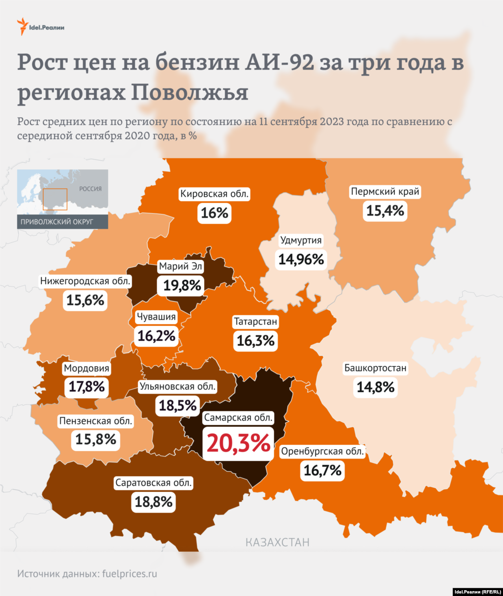 Так, бензин марки АИ-92 сильнее всего за три года вырос в Самарской области — на 20,3%, следом по росту идет Марий Эл — на 19,8%.