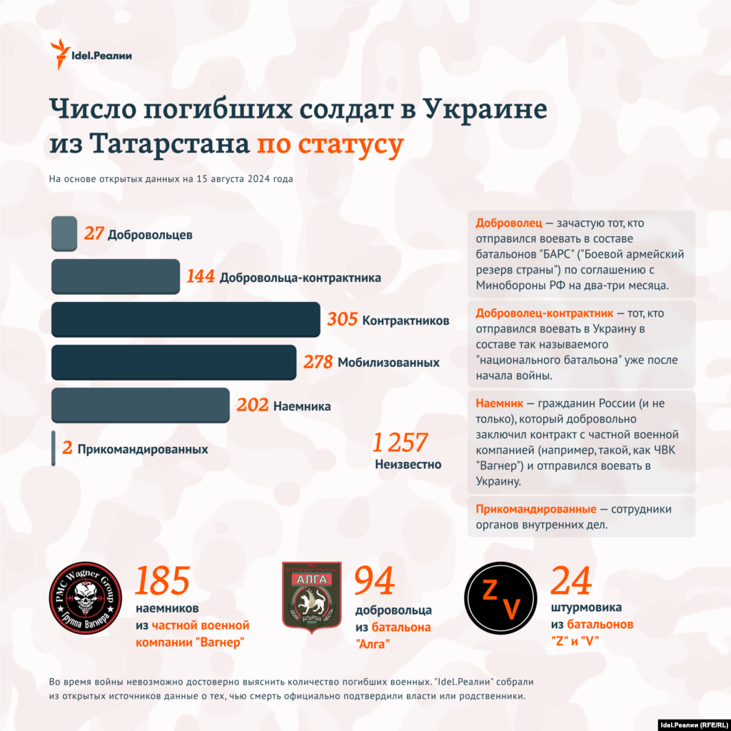 "Idel.Реалии" собрали всю известную на данный момент информацию о погибших на войне уроженцах Татарстана — возраст, звания, районы, образование, дети, медали и др. Всего, по данным на 15 августа 2024 года, погибшими признаны как минимум 2 215 человек из Татарстана.