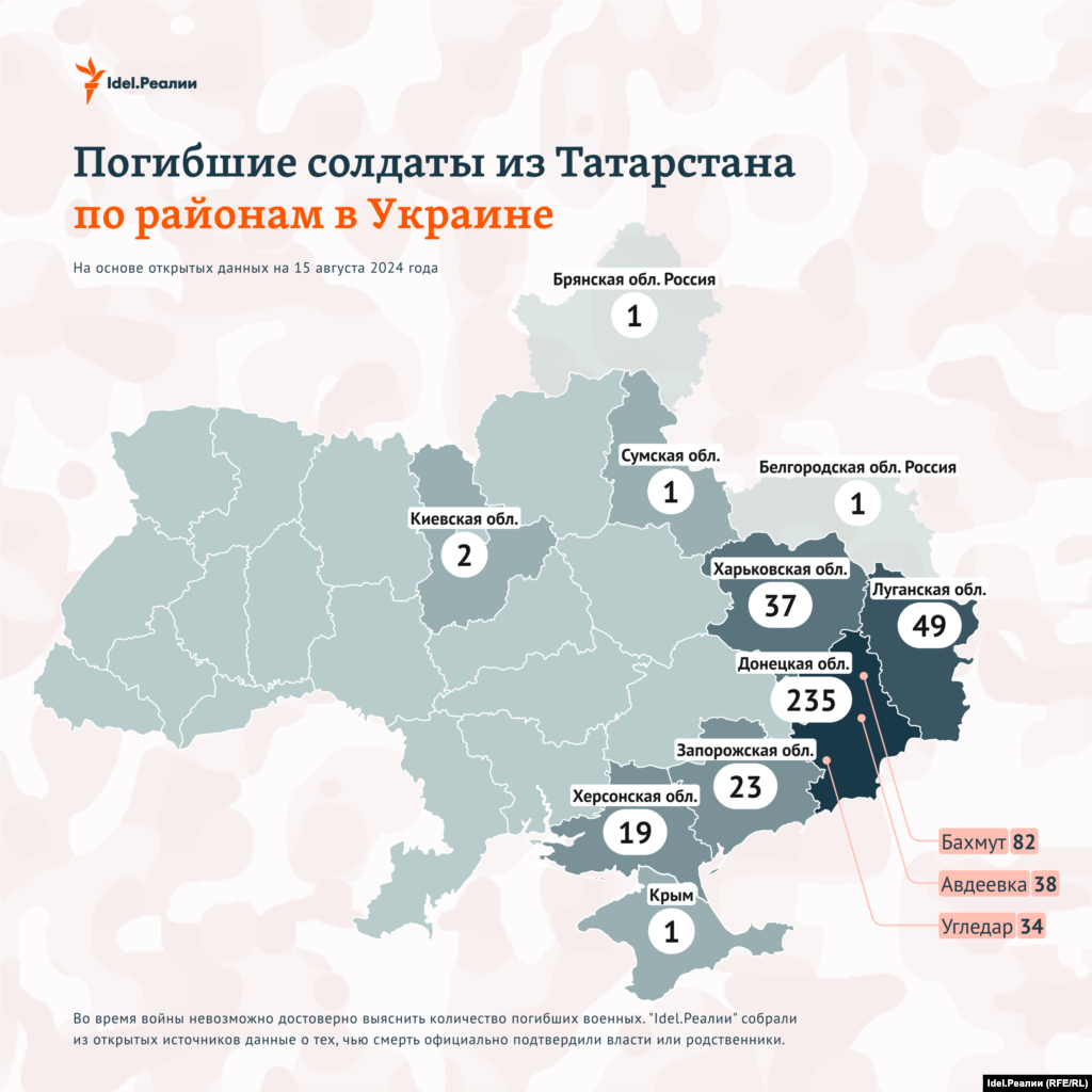 Больше всего погибших из Татарстана фиксируется в Донецкой области Украины — 235.