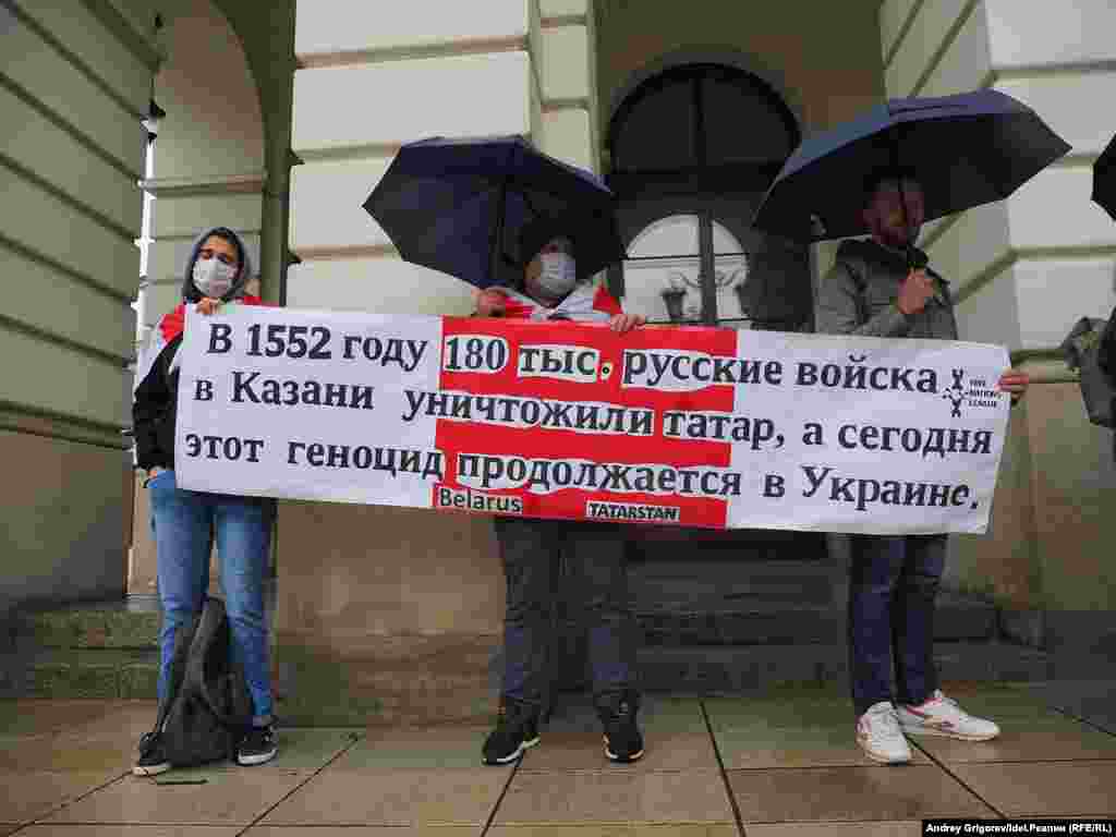 Всего, несмотря на проливной дождь, собралось более тридцати человек, которым Нафис Кашапов раздал плакаты собственного изготовления. Надписи на плакатах были сделаны на разных языках — русском, татарском, украинском, белорусском, польском, английском.