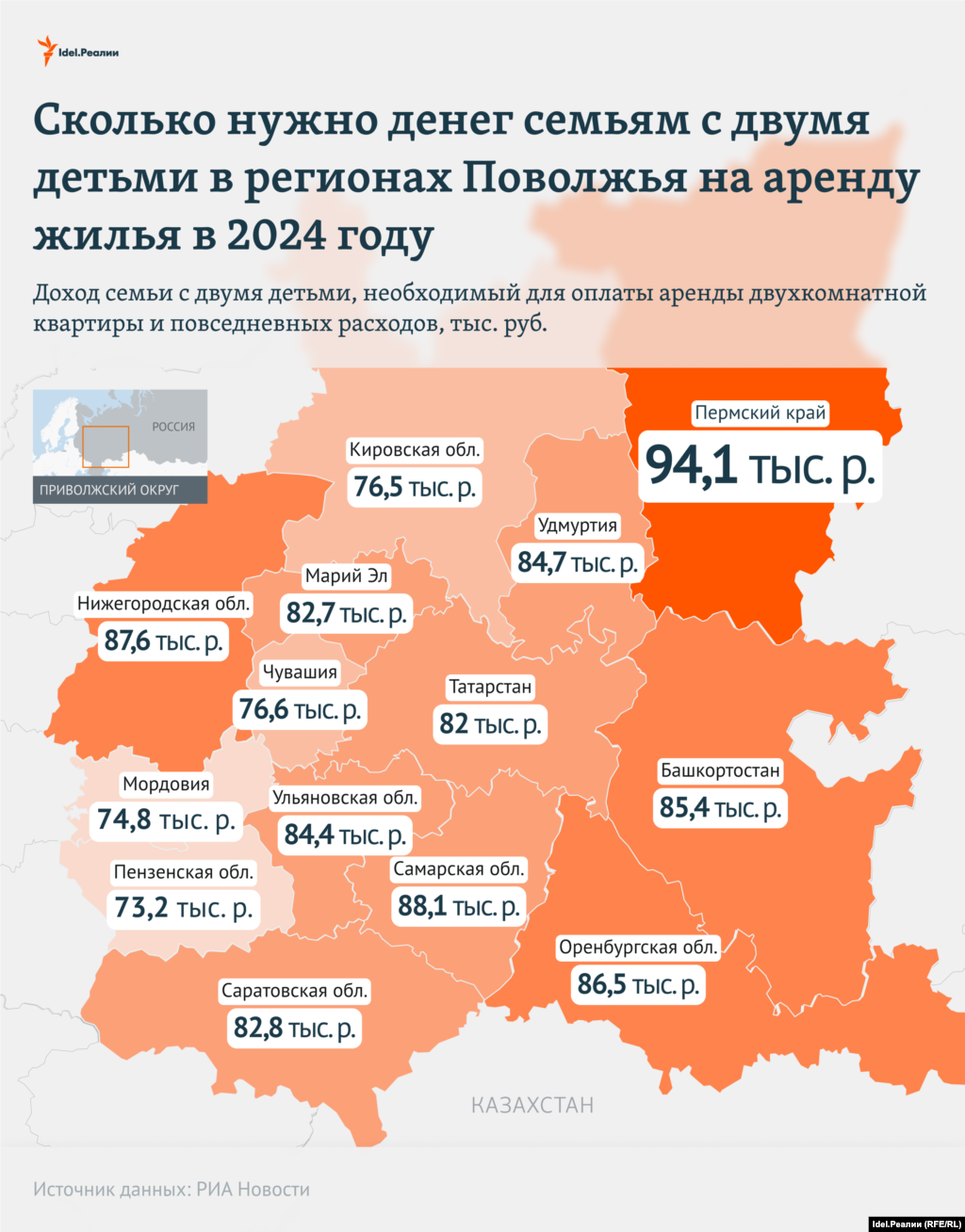 Из регионов Поволжья аренда жилья наиболее доступна жителям Татарстана (8 место в России, 61,2%) — в республике нужно иметь доход как минимум 82 тысячи рублей.