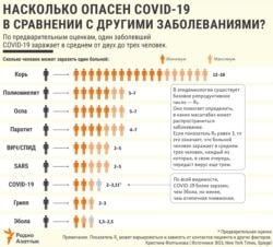 COVID-19 более заразен, чем Эбола, но менее, чем атипичная пневмония. Один заболевший коронавирусом инфицирует в среднем от двух до трех человек.
