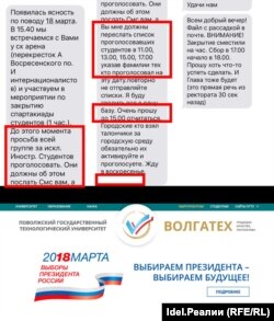 МАРИЙ ЭЛ. Местный штаб Алексея Навального опубликовал в социальных сетях сведения из переписки студентов МАрГУ и ПГТУ (Волгатех) — двух крупнейших государственных вузов республики. Студентов в общежитиях заставляют заполнять заявления о голосовании по месту нахождения. Процедура контролировалась — написавшие заявление отмечены в некоей ведомости. Не написавшим нужно сделать это ОБЯЗАТЕЛЬНО. И — за общежитием закреплён сотрудник МФЦ (многофункционального центра по предоставлению Госуслуг). В Волгатехе же, судя по следующему скриншоту, ведётся точная статистика всех проголосовавших студентов. Данные по явке в вузе собирают прямо как в избиркоме: по состоянию на 11, 13, 15 и 17 часов.