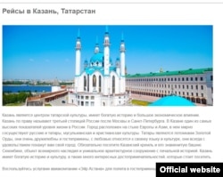 У российского национального перевозчика фигурируют стандартные клише: улица Баумана, мечеть Кул Шариф, Петропавловский собор, Кремлёвская набережная... Удивляет, разве что, упоминание Дворца земледельцев, который в ночное время "становится сказочным замком благодаря чудесной подсветке".