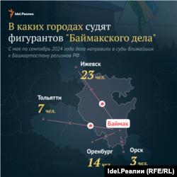 По данным "Idel.Реалии", с мая по сентябрь 2024 года в суды ближайших к Башкортостану регионов России направили около 40 дел (из порядка 90 известных редакции) обвиняемых по "Баймакскому делу". Башкортостанская прокуратура обосновывает это тем, что фигуранты могут оказать "давление на участников судопроизводства", в том числе при помощи "оппозиционных СМИ и иноагентов". Правозащитники указывают на незаконность и необоснованность переноса процессов, а адвокаты обвиняемых заявляют о нарушении права их подзащитных на полноценную судебную защиту.